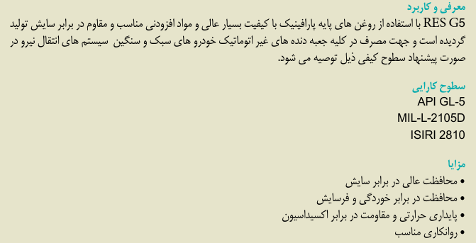 روغن دنده خودرو RES G5res2021-11-21T22:00:17+03:30 بستهبندی: این محصول در بشکههای ۲۰۸ لیتری و ظروف ۲۰ لیتری موجود میباشد.