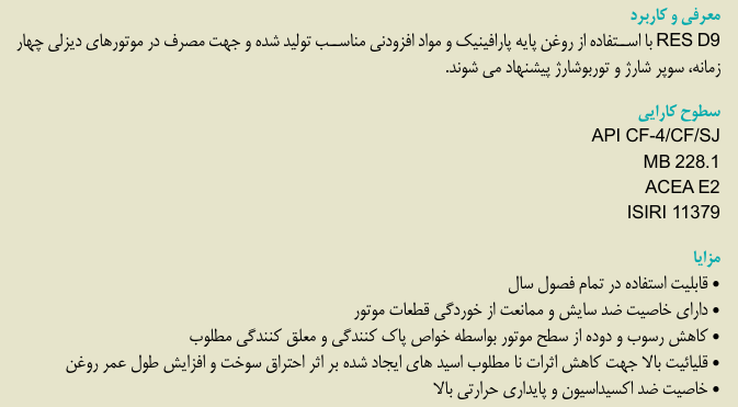 روغن موتور دیزلی/بنزینی RES D9res2021-11-21T21:41:30+03:30 بستهبندی: این محصول در بشکههای ۲۰۸ لیتری و ظروف ۲۰ لیتری موجود میباشد.
